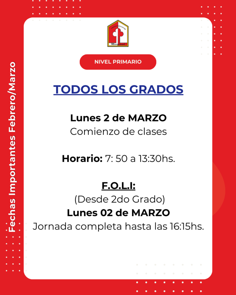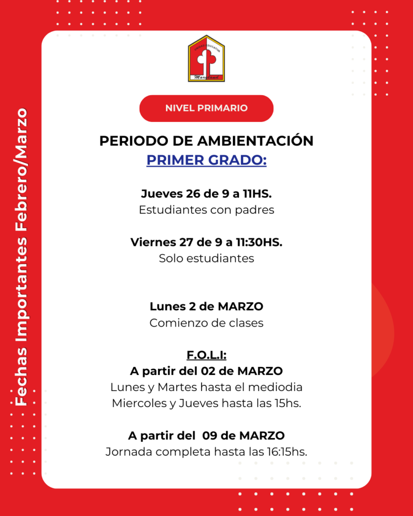 Inicio de clases/ambientación Nivel Primario El evento está terminado. Fecha Feb 26 2026 ¡Caducado! Hora 9:00 am - 11:00 am Compartir este evento